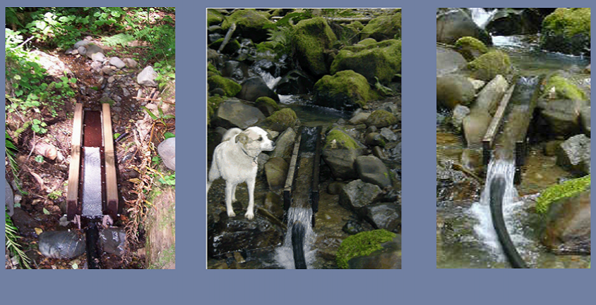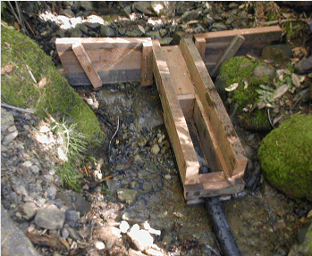 Our intake boxes are designed for a flow of 5 to 50gpm or 200gpm. They are built from salvaged redwood, with heavy-duty stainless steel screen and stainless steel screws. The box may be cemented, staked, or secured with rocks in the creek bed and will be completely submersed during high water. Excess water washes over the screen, keeping it clean during times of high water, which usually carries a lot of debris and silt.